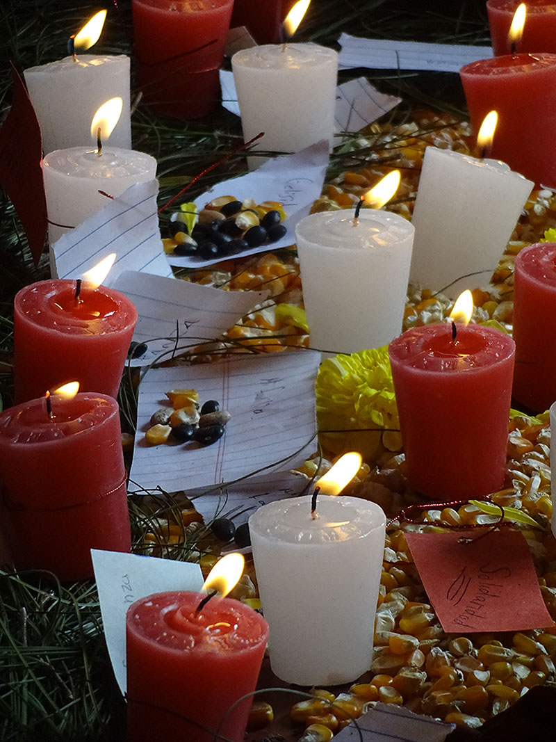 En el video-documental, titulado Que el corazón no esté partido, que SIPAZ produjo en 2015, como parte del proyecto de sistematización de los aprendizajes de los 20 años, el mismo José Alfredo Jiménez, de Las Abejas, explicó que en el idioma tsotsil de Los Altos de Chiapas, el término “paz“ se traduce como jun o´ontonal, que podría entenderse como: “un corazón“ o “que el corazón no esté partido“. Se refiere a que el pueblo siga unido en momentos difíciles y que problemas y conflictos no generen divisiones. Como también comentó Martha Ramírez, siendo ella indígena me´phaa de la región de la Montaña de Guerrero: “dicen los abuelos, lo que se hace de corazón nunca muere“. Con este mensaje del corazón pleno guiado por las luces en el camino se cerró el evento de la celebración de los 20 años de presencia de SIPAZ en el sur de México. Celebrando que sigamos con esperanza y dignidad luchando…