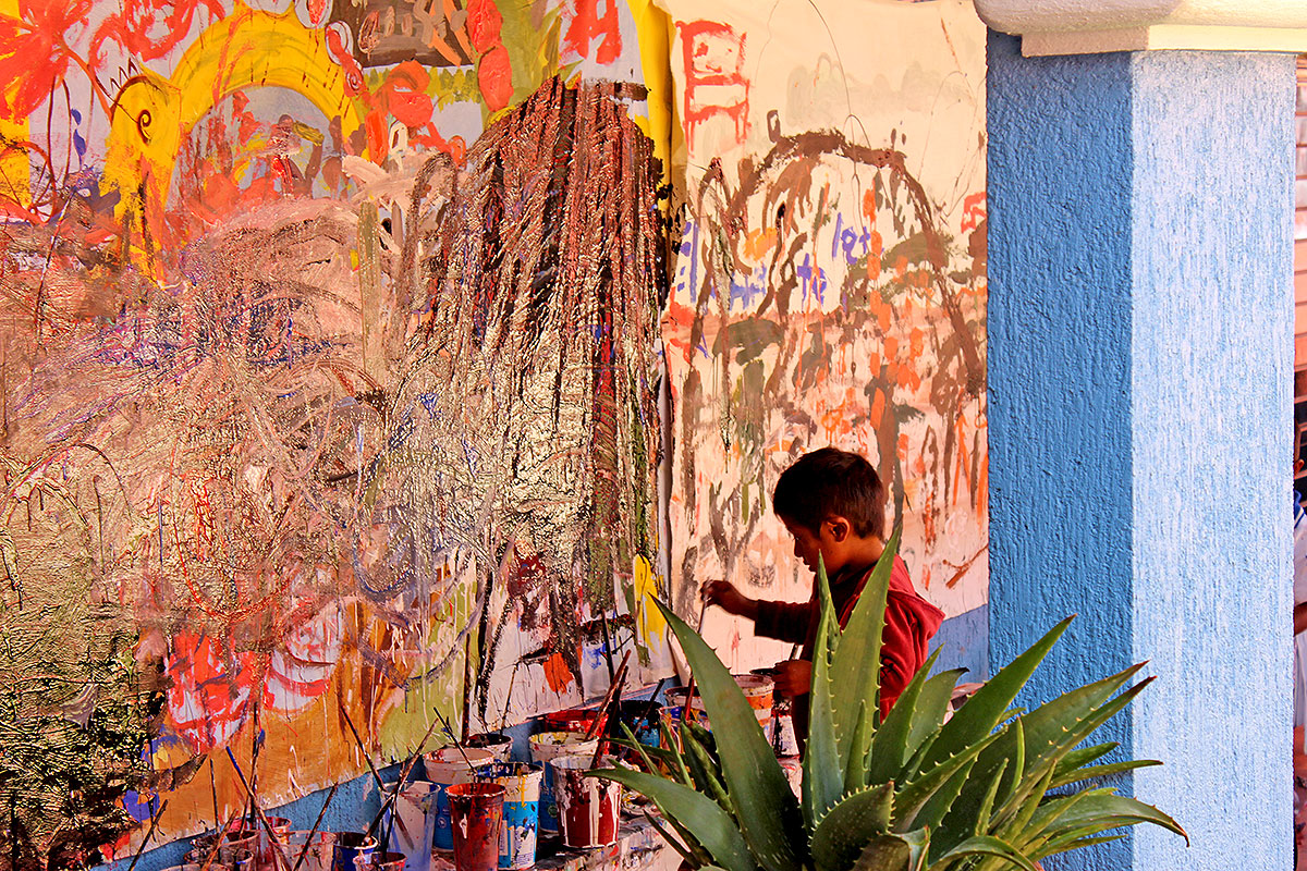 Philip MacManus, quien fuera el primer presidente de SIPAZ y se hizo presente enviando un mensaje en video compartido en el evento, habló de los intereses económicos que amenazan el bienestar y la unidad de los pueblos. «La división es una gran amenaza que responde a varias causas: hay que entender que hay intereses ajenos para provocar divisiones. Entonces un desafío es cómo enfrentar ese fenómeno sin caer en una perspectiva de que se trata de una división entre buenos y malos«. Otra interpretación de la oscuridad del contexto social y político que se está viviendo en México fue creada por un grupo de niñ@s, algun@s pertenecientes a las familias desplazadas de la comunidad Banavil, municipio de Tenejapa, Chiapas, que estuvieron presentes en el evento, acompañando a sus padres y madres. Se dieron a la tarea de pintar un mural de 2 por 3 metros cuadrados sobre la actualidad mexicana. Lo que comenzó siendo un paisaje con plantas, flores, cerros, animales y personas, terminó como una gran mancha negra. L@s mism@s niñ@s titularon a la obra “el desastre”.